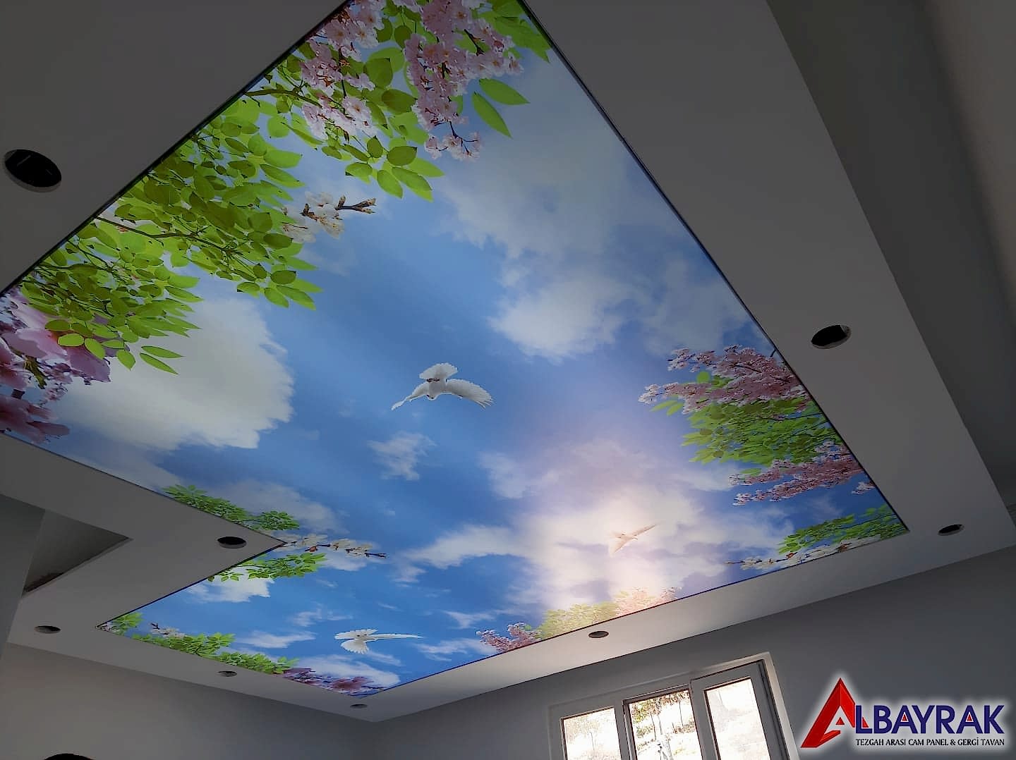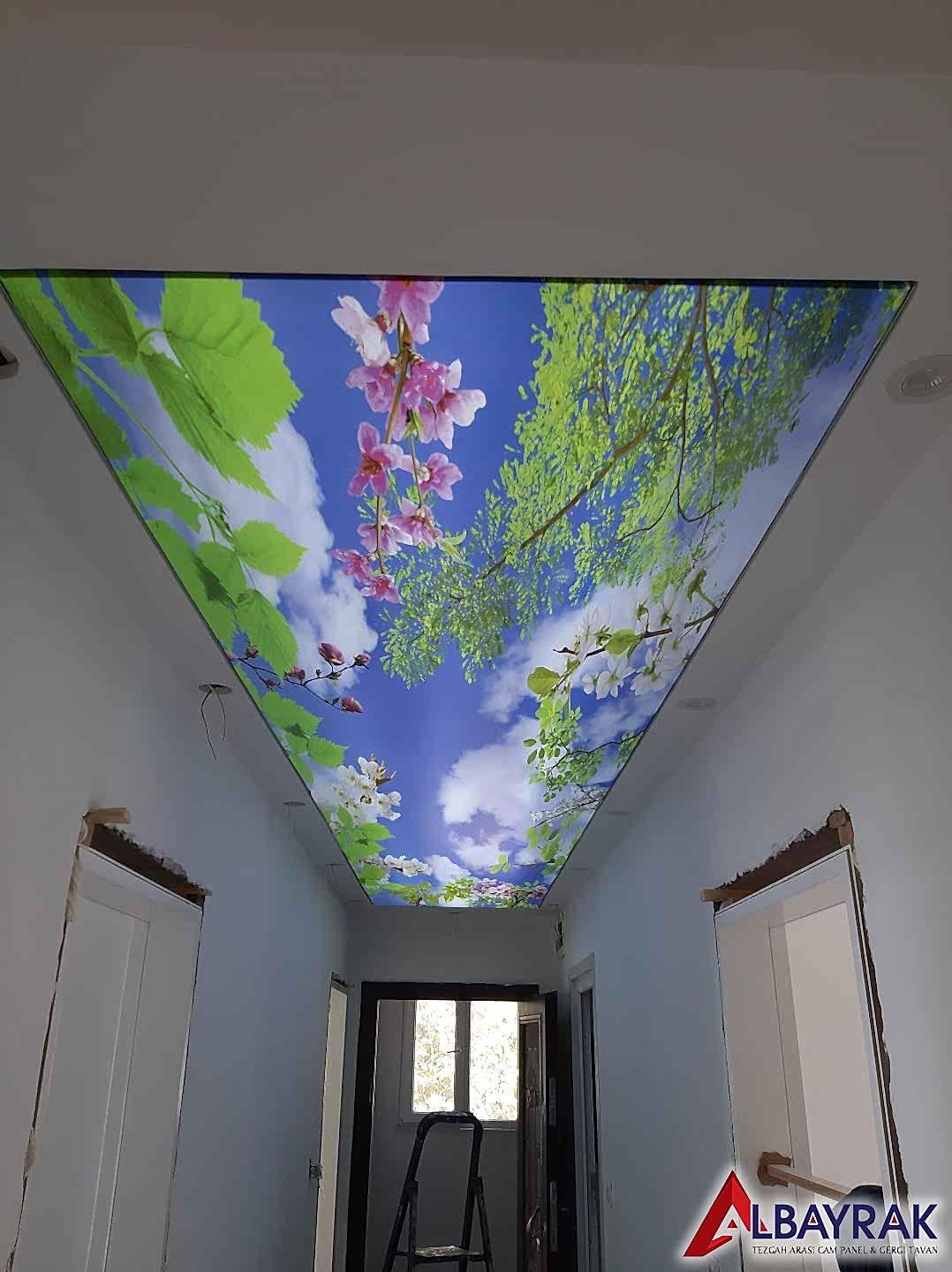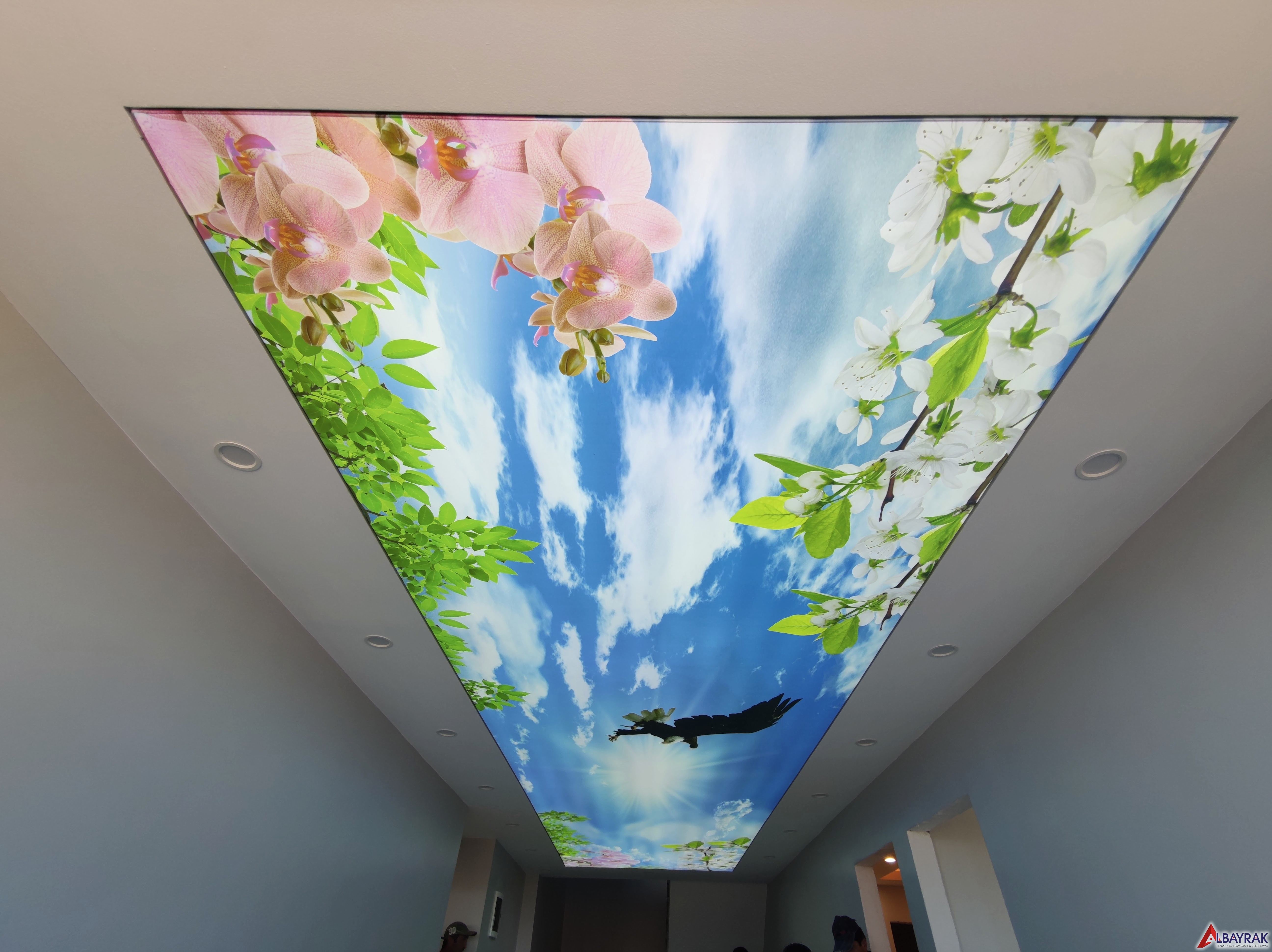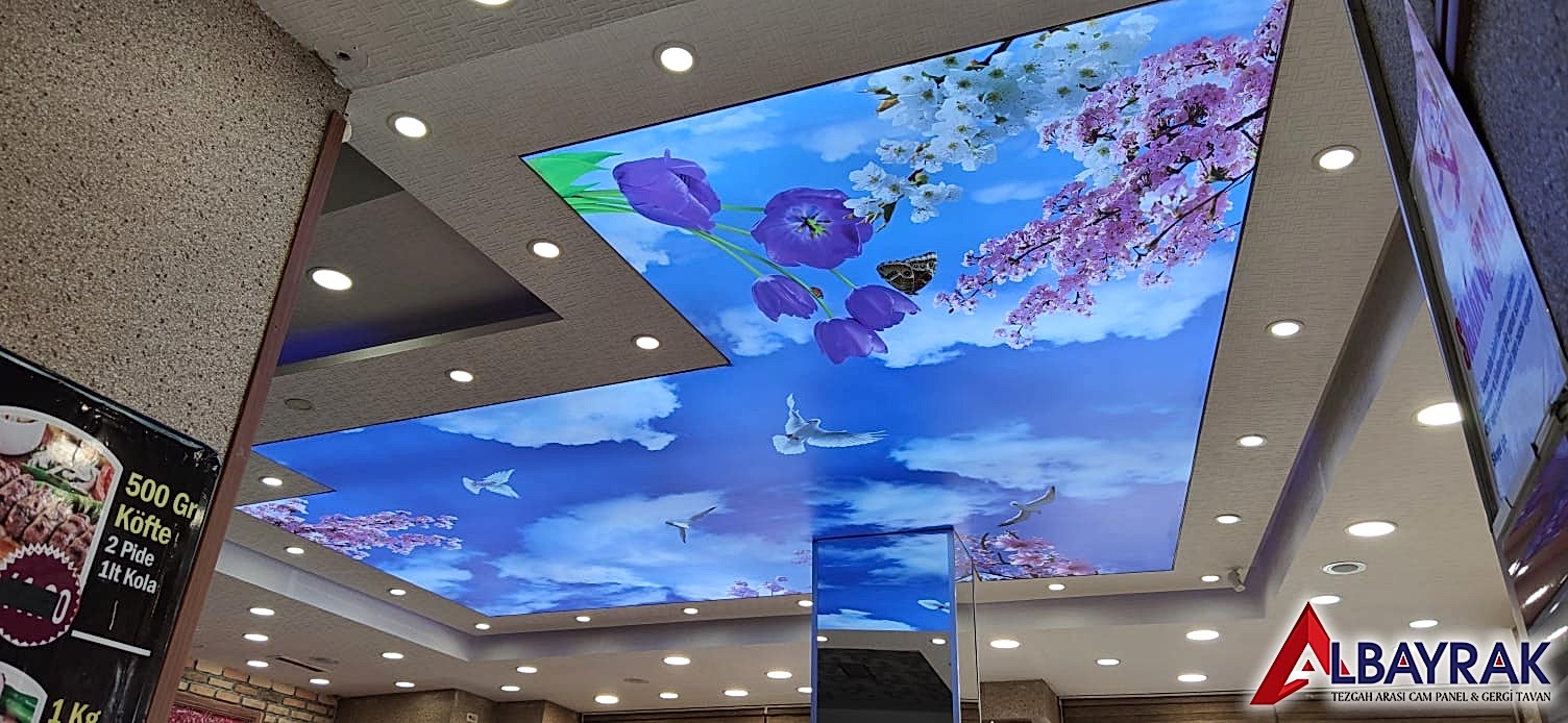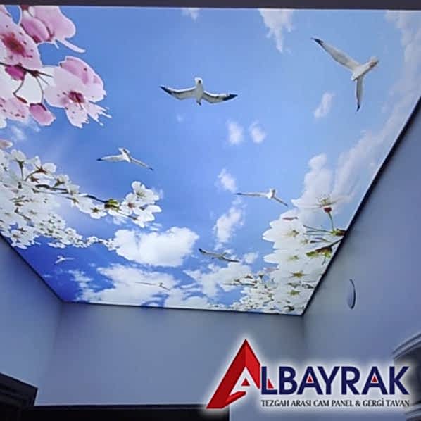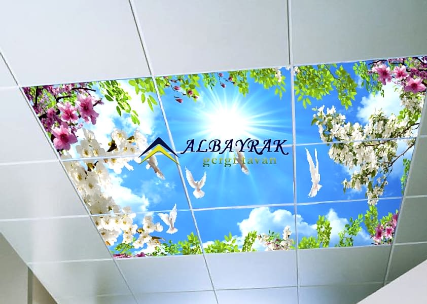 Gökyüzü Gergi Tavan yada Gökyüzü tavan olarak adland�r�lan gergi tavan çal��mas�nda bulut resimi ve mavi tonlar�n�n a��l�kl� olarak yer ald��� çal��mada milyonlarca model deste�i sunuyoruz. Gökyüzü tavan malzemelerini Türkiyenin her noktas�na ayn� gün kargoya vererek gönderim yapabiliyoruz.